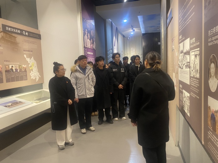 在庄严肃穆的张纯如纪念馆内,师生们在讲解员的引导下,依次参观了“大洋彼岸的父母之邦”“直面真相的《南京大屠杀》”“光照人间的正义天使”等主题展区。通过珍贵的历史影像、手稿和实物资料,大家深入了解了张纯如女士以笔为剑、向世界揭露历史真相的艰辛历程,感受其坚守正义、不畏艰难的精神风骨。在张纯如雕像前,全体人员肃立默哀,表达对这位历史捍卫者的深切缅怀。理论导师李鑫结合展陈内容,现场讲授微党课,强调:“张纯如精神是爱国主义与历史担当的生动体现。新时代青年要从中汲取力量,将个人理想融入民族复兴的伟大征程。”
