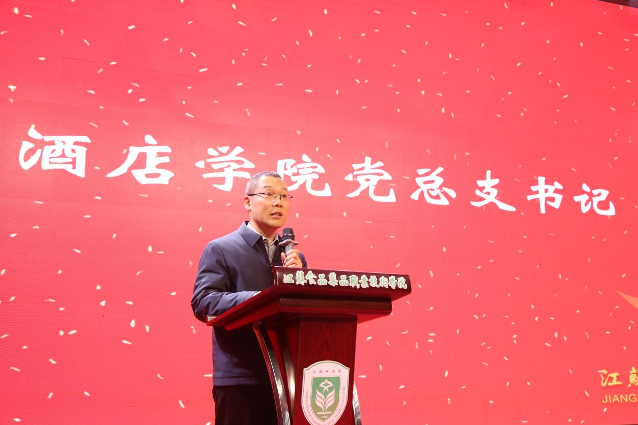 仪式在激昂的进行曲中正式开启。酒店学院党总支书记拾以超首先致辞。他代表学院党总支向全体新生表示热烈祝贺,并深刻阐述了身着制服所承载的深厚意义。拾书记指出,制服不仅是专业身份的外在标志,更是职业荣誉、责任担当与匠心传承的象征。他勉励同学们以“厨德为本、技艺为魂”为准则,在传承中创新,在磨砺中成长,淬炼出属于新时代烹饪人的精神品格。