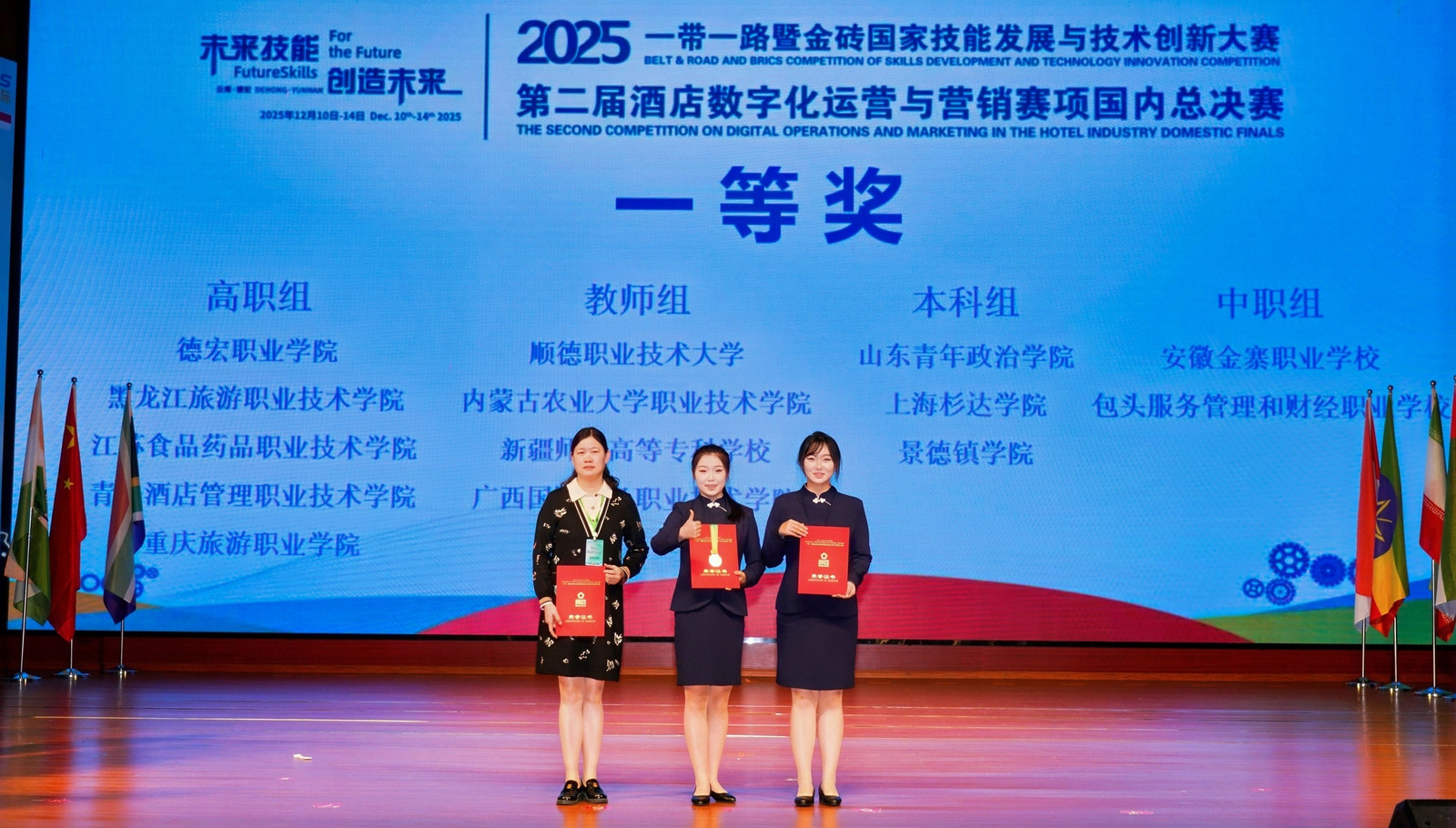 12月13日,2025年“一带一路”暨金砖国家技能发展与技术创新大赛第二届酒店数字化运营与营销赛项国内总决赛在云南省德宏州芒市德宏职业学院圆满落幕。该赛项要求选手完成酒店核心知识理论考核、酒店前厅接待数字技术应用、酒店运营数据基础分析与营销策划优化方案制作。我校酒店学院酒店232班李文静与西烹241班袁慈组成的学生代表队(指导老师:沈子杨,钱惠新),与来自全国本科、高职、中职及教师组等125支院校代表队,近500人同场角逐,最终斩获高职组一等奖。