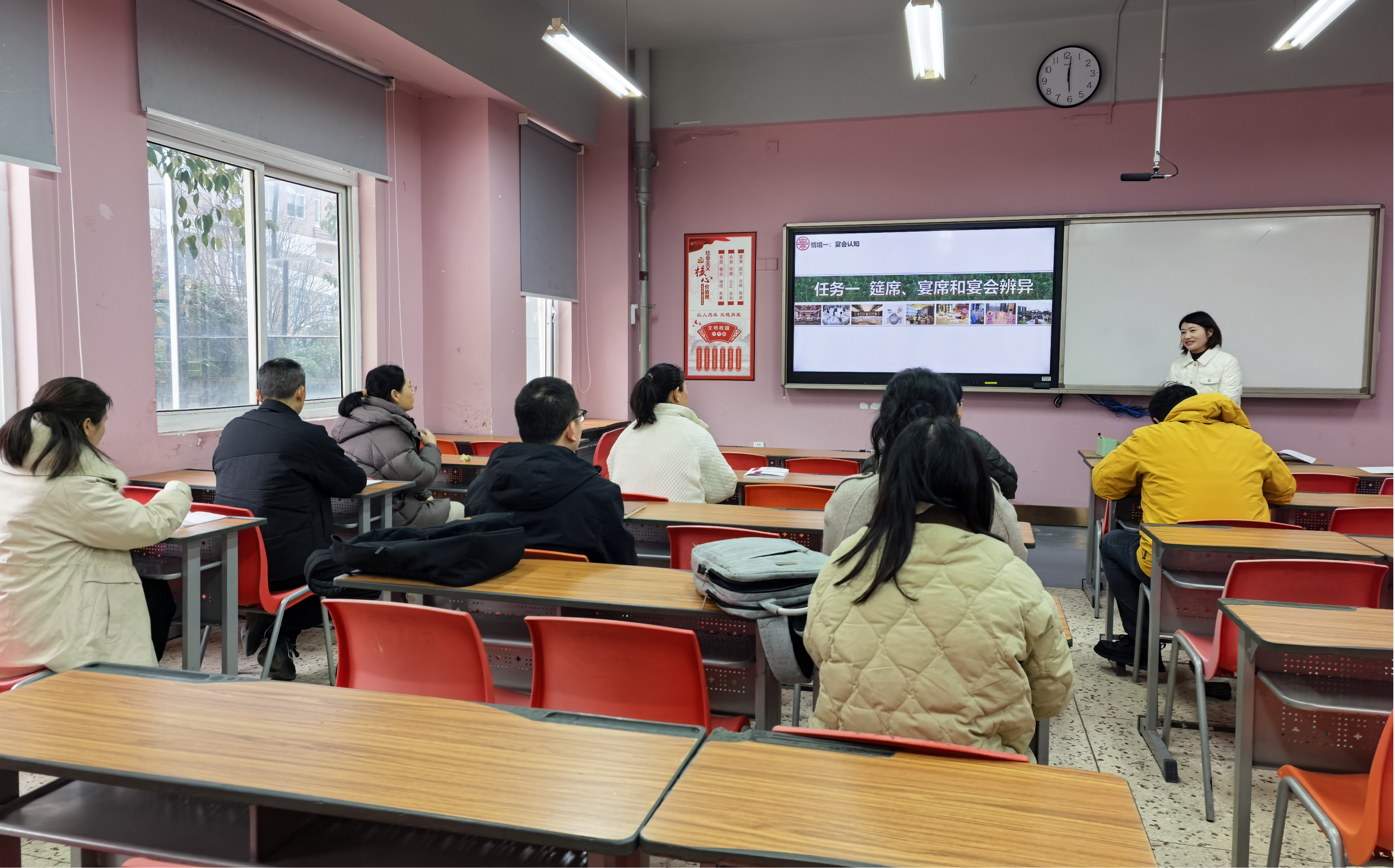 培训会上,两位外聘教师分别就本学期所授课程内容进行了一节完整的无生授课展示。烹饪专业群专业负责人及课程团队的多位校内专任教师亲临现场,认真观摩了授课全过程。